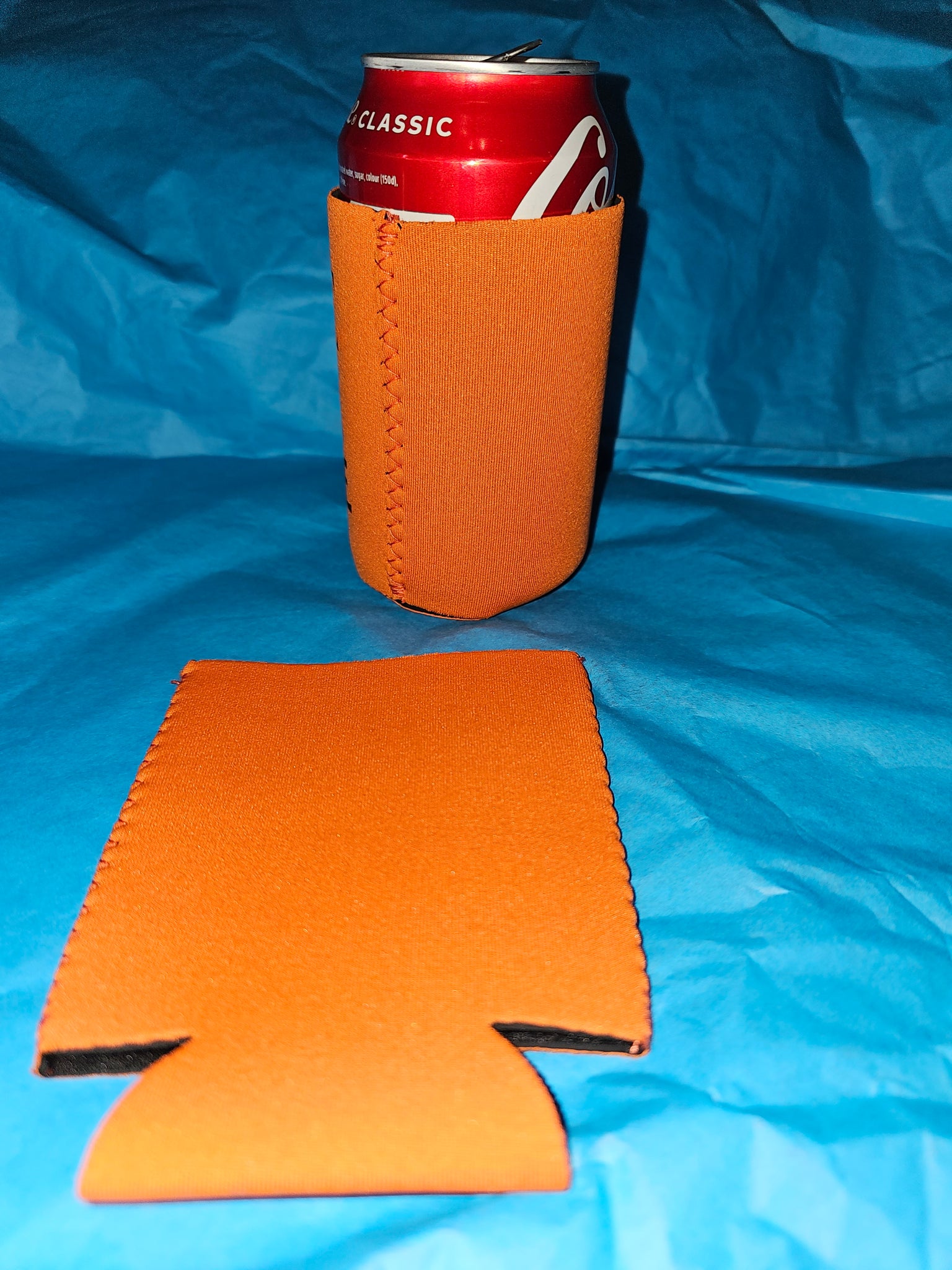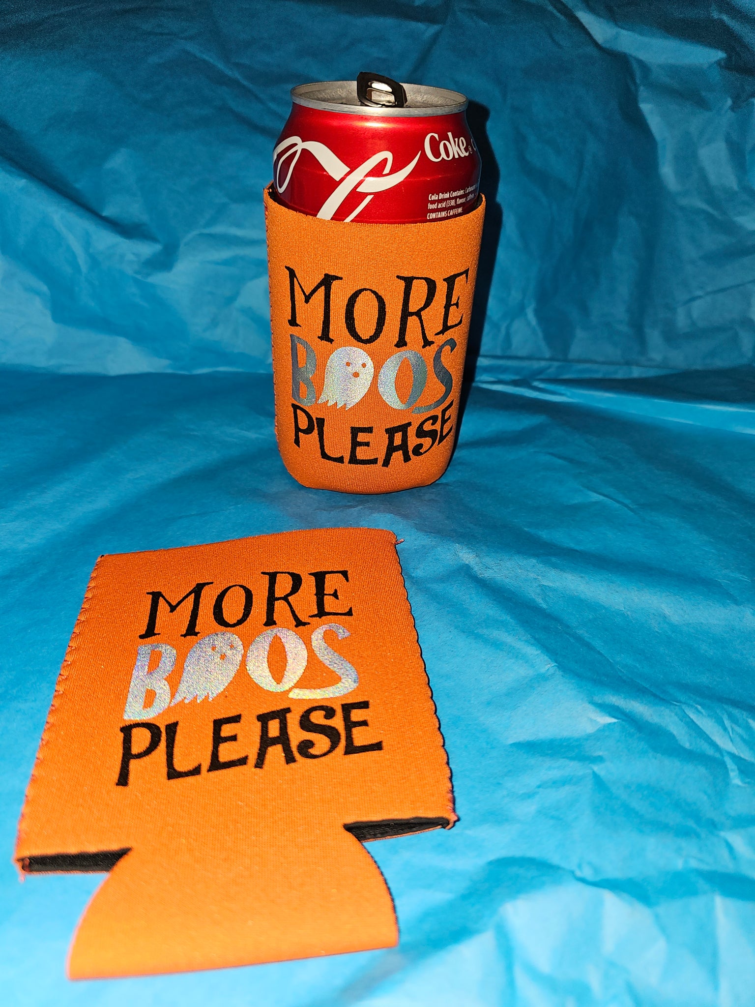 Orange flat stubby cooler with ' More Boos Please' printed on to it